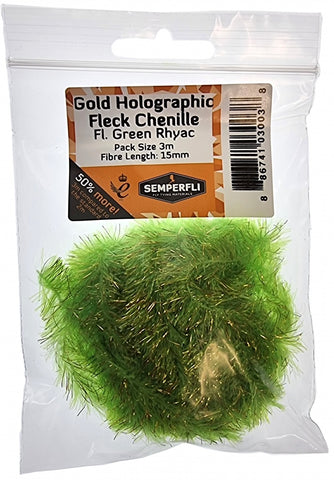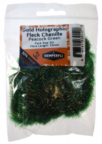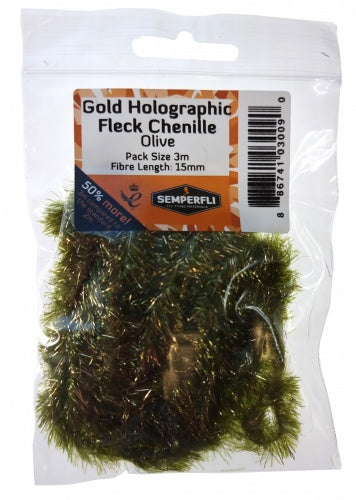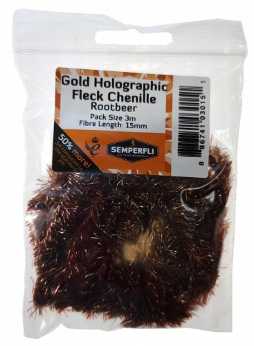 Gold Holographic Fleck 15mm Large is a stunning 15mm chenille with tinsel highlight guard hairs. Chenille can be used for a large variety of fly patterns from stockie killing Blobs to bodies on streamers and lures. Gold Holographic Fleck 15mm Large chenille to the next level with guard hairs acting as an extra attraction